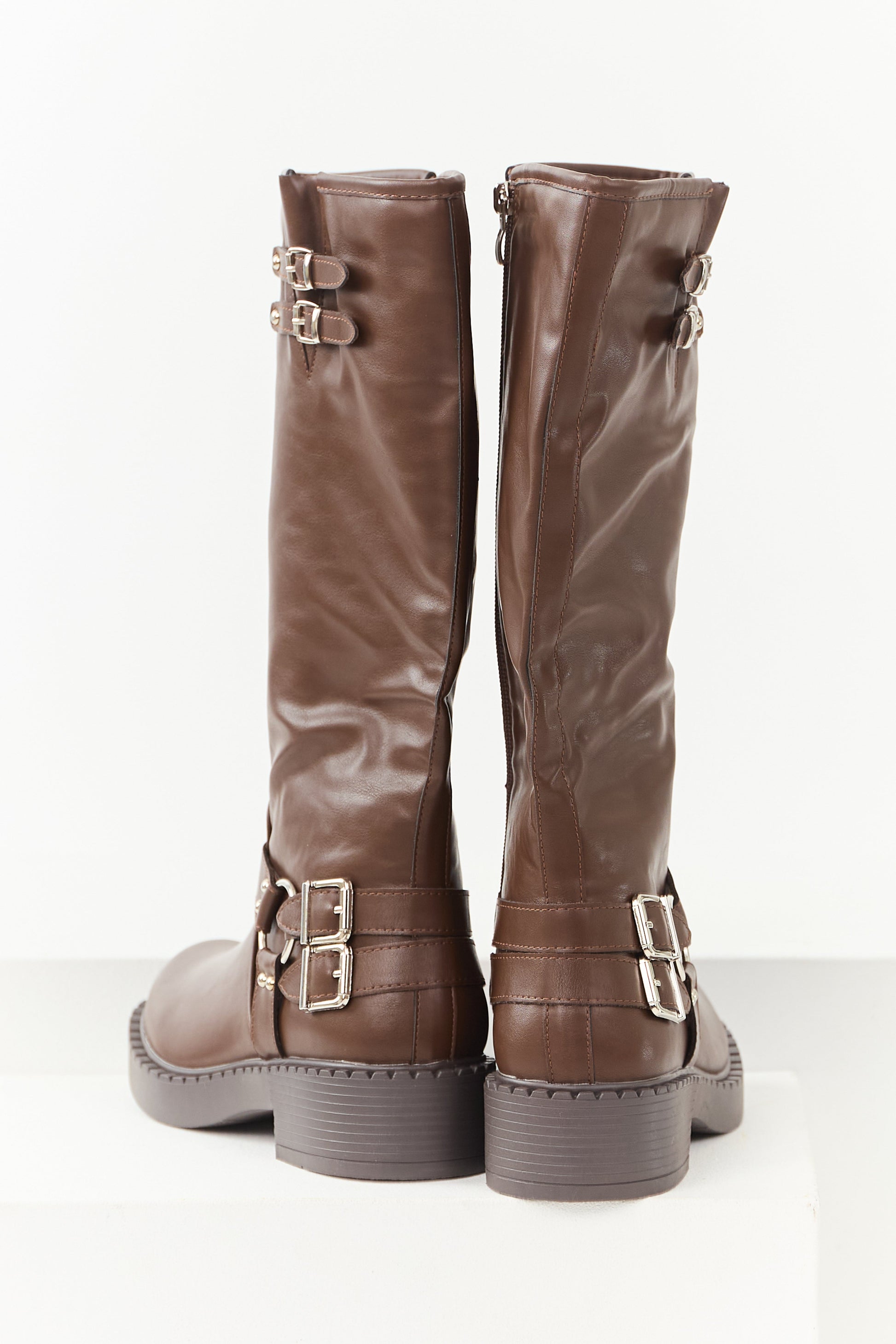 Chocolate Faux Leather Buckle Detail Tall Boots